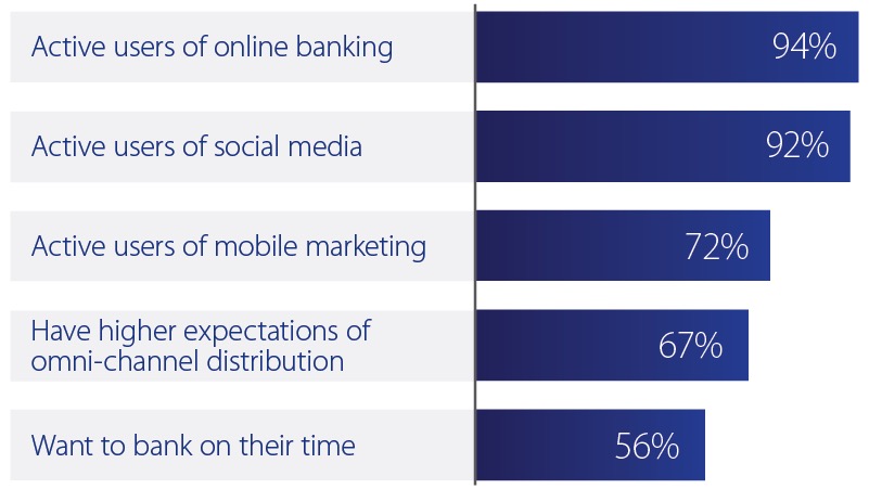 Millennials rely heavily on digital channels. More than 90 percent are active users of online banking, and they prefer to use digital channels to reach quick and easy resolutions to problems. To successfully attract and retain their business, offer high-quality customer service with emphasis on digital channels and self-serve capabilities.